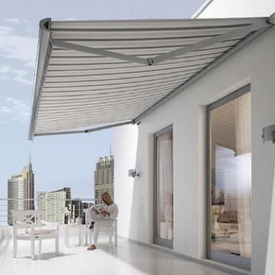 Schaumann Markisen: Für Groß­formate bis 700 cm, wind- und wetter­geschützt durch Schalen­konstruktion. Modisch, robust und schmutz­abweisend.